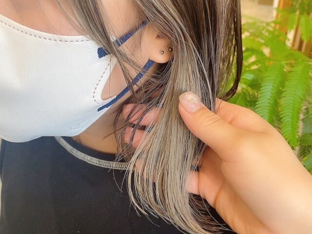 ネイビーの色落ちはシルバーっぽくなります🩶 未来ちゃんと楓ちゃんに染めてもらって2週間ぐらいの写真です 染めたても色落ちも楽しめるのでオススメです ブリーチして…