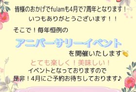 『 7th Anniversary 』 いつもご来店頂き誠にありがとうございます! 皆様のおかげでfulamは4月で7周年となります そこで!!!!! 毎年恒例の「アニバーサリーイベント」を開催致します🥳 楽しくて!美味 […]…